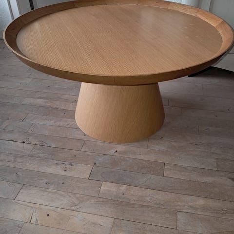 Stort, rundt sofabord lavet af et solidt stel i træ og beklædt med messing.