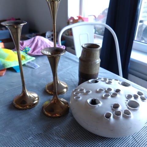 4 trekløverformet vintage lysestager med emalje. Aldersrelateret patina, og den ene hvide har lidt fejl i emaljen - se billeder.