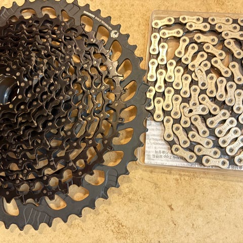 SRAM PowerGlide PG-1130 kassette+kæde til 11-speed gearsystem. Kassetten er beregnet til cykler med 11 gear og er kompatibel med SRAM 11-speed drivlinjer. Velegnet som udskiftning eller opgradering af eksisterende kassette på racercykel eller anden cykel med 11-speed system.