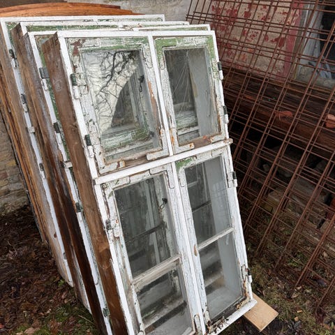 Gamle trævinduer med sprosser i hvid og grøn maling. Vinduerne har flere rammer med enkeltlagsglas og originale beslag og lukkemekanismer. Malingen er afskallet flere steder, og træet fremstår patineret. Velegnet til renovering, udskiftning i ældre bygninger eller til genbrug i projekter som drivhus, orangeri eller dekoration. Ca.-mål kan aflæses på billedet med tommestok. Sælges samlet eller efter nærmere aftale afhængigt af antal vinduer, der ønskes.