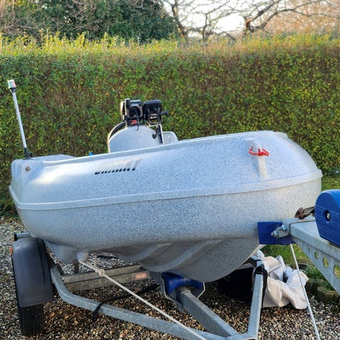 Fin 14 fods Ryds 465 jolle med 9;9 hk sea-fox (Yamaha) med indbygget el start helt ny har Max kørt 5 timer og Branderup trailer med attest