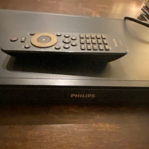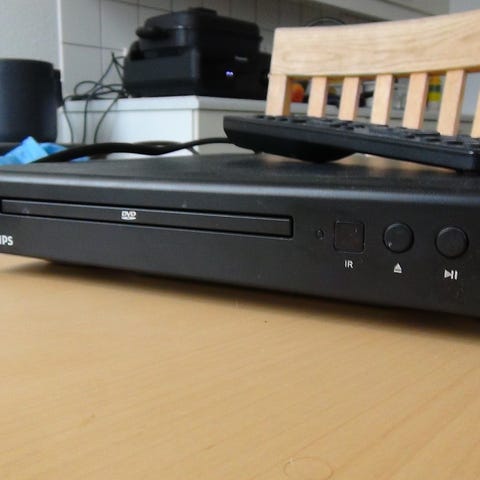 Philips TAEP200 DVD-afspiller i sort. Enheden har frontbetjening med knapper til betjening af afspilning samt diskbakke til standard DVD-medier. På bagsiden findes analoge lydudgange (stereo RCA rød/hvid) og komposit video-udgang (gul RCA). Strømforsyning: 100-240V, 50/60 Hz, effektforbrug 15W. Produceret i 2021. Egnet til afspilning af DVD-film og andet kompatibelt DVD-medie på tv eller skærm med tilsvarende indgange.