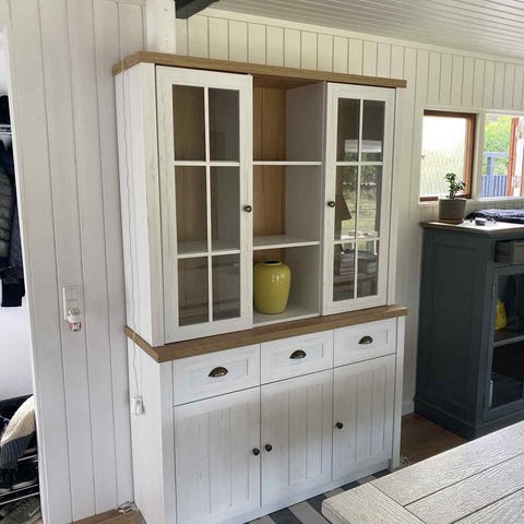 Flot og stilrent vitrineskab i natur eg – model VESTERBY lav fra JYSK.