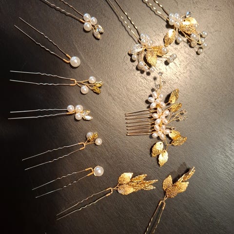 Hårpynt sæt med hvide perler. Sættet består af 26 stk. små spiralformede hårspiraler med perler samt5 stk. hårnåle med perler, der kan fordeles i frisuren. Egnet til opsætninger som fletninger og knolde, fx til konfirmation, bryllup eller andre festlige lejligheder. Leveres i en lille stofpose til opbevaring.