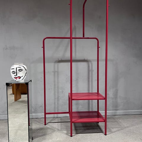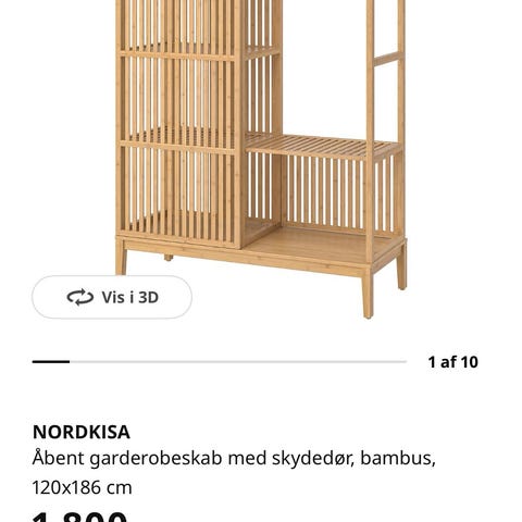 IKEA NORDKISA garderobestativ i bambus. Åbent stativ med lameller og integrerede hylder til opbevaring af tøj, sko eller tilbehør. Egnet til brug i soveværelse, entré eller walk-in-closet, hvor der er behov for både hængeplads og hyldeplads. 1 år gammel og uden synlige brugsspor.