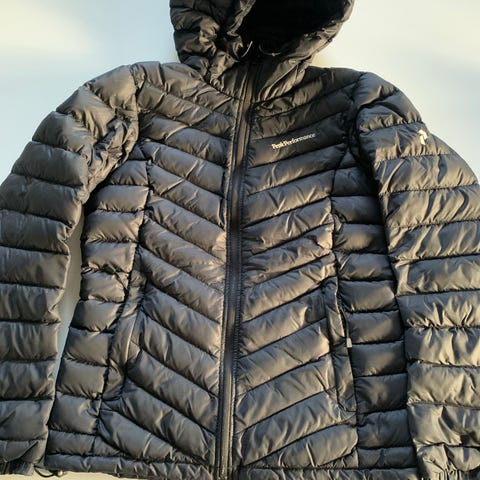 Peak Performance Frost dun-vinterjakke til kvinder i størrelse L. Lang model med gennemgående lynlås foran og hætte. Jakken er sort og fyldt med dun, hvilket giver god isolering i koldt vejr. Velegnet som yderjakke i vinterhalvåret til daglig brug og udendørsaktiviteter.
