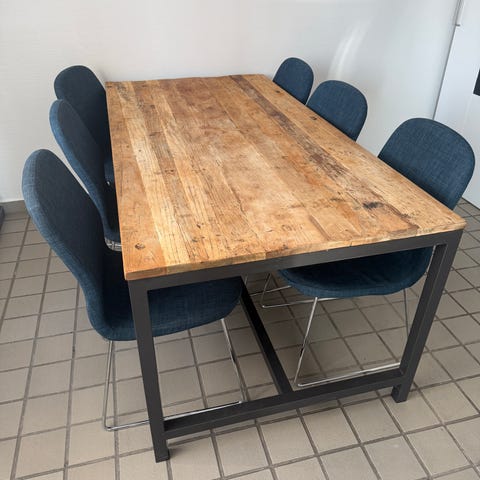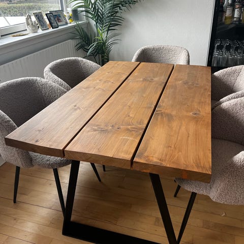 Plankebord (130x78 cm) med 4 stk. sorte koniske træben, som nemt kan skrues af. Plankerne er behandlet med Dark Coco olie. Bordet har 3 små hakker/skader (se billeder).