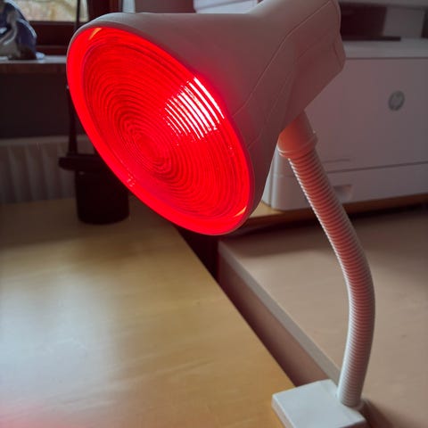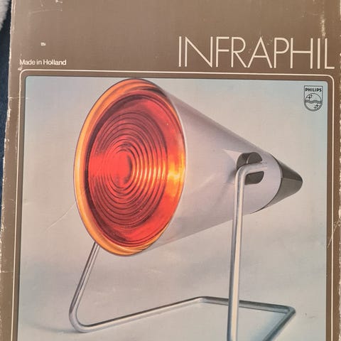 Philips Infraphil varmelampe. Lampen har infrarød pære og cremefarvet kabinet med røde detaljer. Den står på en justerbar metalfod, så den kan vinkles efter behov. Udstyret med ledning og stik til almindelig stikkontakt. Fin stand