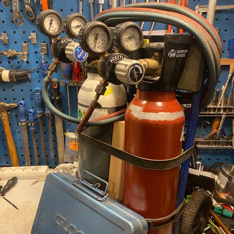 Autogen svejse- og skæreudstyr med gasflasker og brænder