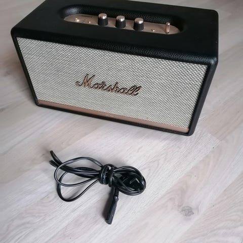 Marshall højttaler i sort kabinet med klassisk frontstof og guldfarvede betjeningsknapper på toppen. Enheden har indbygget strømforsyning, bagudvendt basrefleksport og tilslutningsmuligheder på bagsiden. Velegnet som stationær højttaler til musikafspilning i hjemmet.