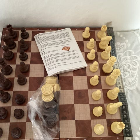 Skaksæt med foldbart bræt i træ og komplette skakbrikker i to farver. Brættet har markerede rækker og kolonner med bogstaver og tal langs kanterne. Sættet inkluderer brikker til begge spillere samt et hæfte med skakopstilling og grundlæggende regler. Velegnet til hjemmebrug, rejser eller undervisning i skak.