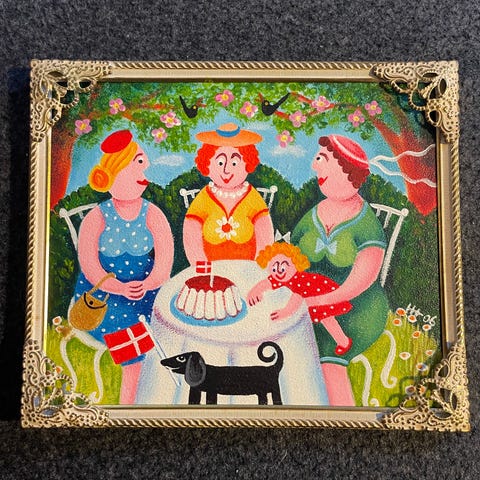 Hanne Haufeldt "Undskyld!" maleri i lille format på ca. 11 x 15 cm. Motivet viser en person med buket blomster og en hund i en farverig have med solsikker, træ og fugl på blå himmel. Maleriet er indrammet i en smal, gylden ramme. Oplysninger om kunstner, titel og mål fremgår af etiketten på bagsiden.