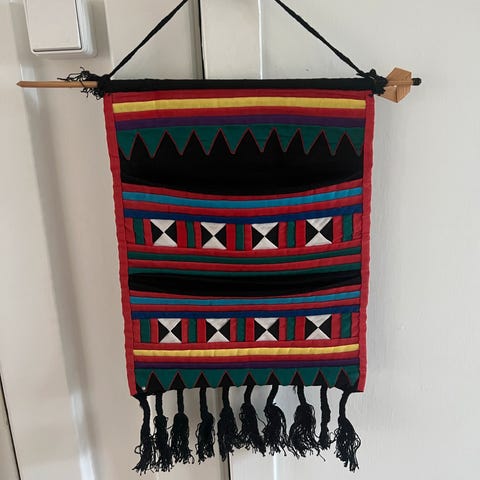 Kurv flettet af genbrugspapir i mange farver. Kurven er cylinderformet med en højde på ca. 14 cm og en diameter på ca. 16 cm øverst. Materialet består af strimler af trykt papir, som er snoet og flettet tæt sammen. Egnet til opbevaring af mindre genstande som nøgler, kontorartikler eller småting i hjemmet. Kan stå på bord, hylde eller i reol.