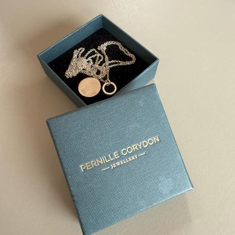 Halskæde, forgyldt, Pernille Corydon, Halskæden ligger bare i æsken uden at blive brugt, derfor sælges det.