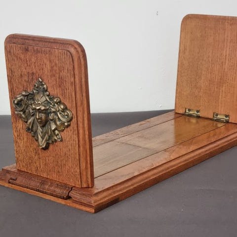 Gammelt trænodestativ i lyst træ. Har fire lysholdere. Kan justeres i højden.
