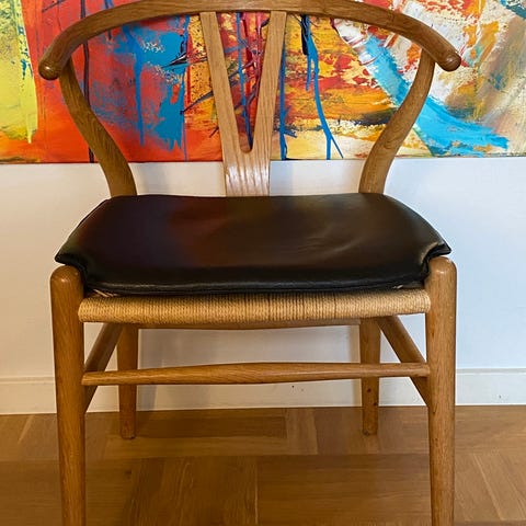 To flotte Y-stole, som er et arvestykke. Både flet og stol er i super kvalitet, omend benene godt kunne bruge en klud nederst. Stabile at sidde i. Pris pr stk. afhentes på Amagerbro