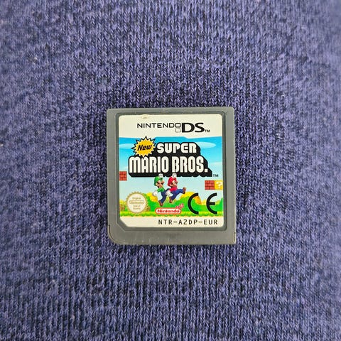 Nintendo New Super Mario Bros. spil til Nintendo DS. Platformspil i Super Mario-serien, udgivet til Nintendo DS-konsollen. Spillet leveres i originalt plastcover med spilcartridge. Forsiden viser aldersmærkning 3+. Bagsiden indeholder information og billeder fra spillet samt tekniske oplysninger til Nintendo DS-systemer.