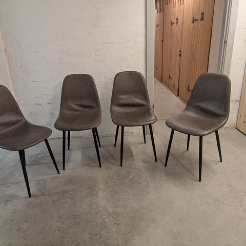 4 stk. spisebordsstole i plast , læder og træ ben. God stand .