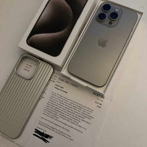 fin velholdt iphone 15 pro, uden ridser eller mærker . den ser ud som ny, med oplader , cover og kabel. batteri tilstand 91%