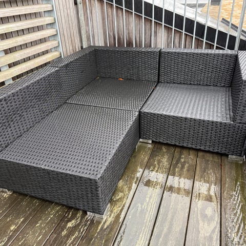 Havesæt bestående af loungesæt med flere sofamoduler og lavt bord. Sættet er udført i sort flet med grå hynder.