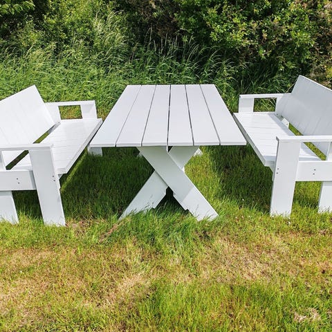 Udendørs bænke / spisebordsbænke af vandbaseret grålakeret massivt fyrretræ.
