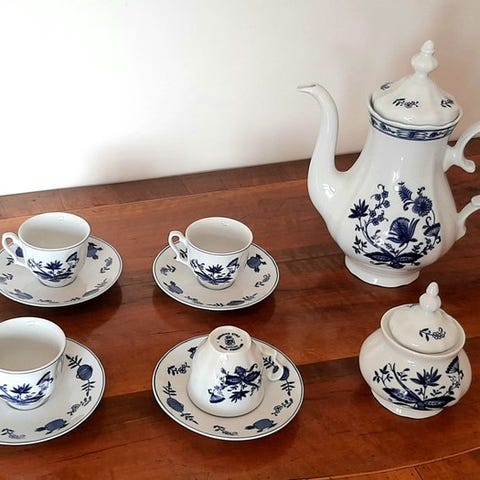 Vintage kaffeservice af keramik fra Tyskland, dateret til 1960’erne–1970’erne, i særdeles god stand med let slid, bestående af 10 stykker: tre kopper, tre tallerkener, en sukkerkrus med låg og tre skeer, dekoreret med fine romantiske medailloner og blank gildet finish. Klik på den blå "gå til varen" knap, for at købe eller byde på denne vare. Den samlede pris vil blive vist inden du afgiver dit bud.