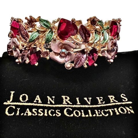 JOAN RIVERS smuk detalje og design. Indlagt med lilla, lilla og andre flerfarvede skårne krystaller, kronblade og blomster. Dette armbånd er en vidunderlig tilføjelse til din garderobe og smykkesamling.