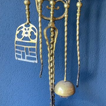 Guldbelagt messing pejsesæt fra Frankrig, dateret 1900–1910, bestående af 5 dele, 70 cm høj, 1 cm dyb og 1 cm bred, i god brugt stand med mindre tegn på ældning og pletter. Klik på den blå "gå til varen" knap, for at købe eller byde på denne vare. Den samlede pris vil blive vist inden du afgiver dit bud.