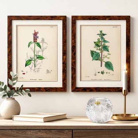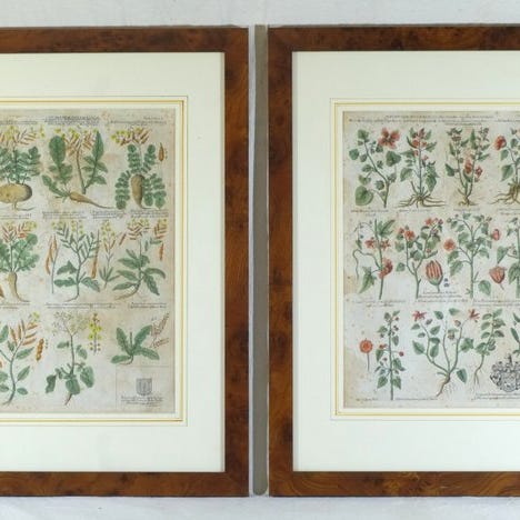 To indrammerede vintage vægdekorationer med farvede sider fra English Botany af Sir James Edward Smith, dateret 1970–1980, lavet af papir, glas og plastik, måler 30 cm i højden, 22 cm i bredden og 4 cm i dybden, oprindelse: Storbritannien. Klik på den blå "gå til varen" knap, for at købe eller byde på denne vare. Den samlede pris vil blive vist inden du afgiver dit bud.