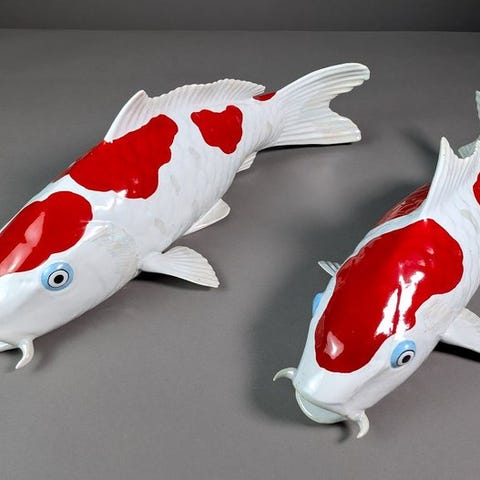 Carpa Koi og lotusblomst, skulptur i flerfarvet porcelæn med stor visuel kraft.