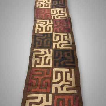 Kuba-textil fra Congo, Shoowa-Kuba-kulturen, provenance belgisk privat samling, mål 360 × 60 cm, anslået periode 1980–2000. Klik på den blå "gå til varen" knap, for at købe eller byde på denne vare. Den samlede pris vil blive vist inden du afgiver dit bud.
