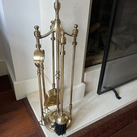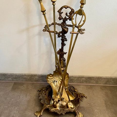 Dette objekt er et vintage metallisk ildstedssæt med askebakke fra det tidlige til midten af det 20. århundrede, formodentlig af europæisk oprindelse. Sættet består af en central stander med aftagelig askebakke, cigarholder og fire klassiske redskaber: en tang, en skovl, en børste og en prik, beregnet til vedligeholdelse af en åben pejs eller rygehjørne. Det tunge metalsfodstykke og patina vidner om alder og brug, med synlige brugsspor og oxidation på indersiden af askebakken og på fodstykket selv. Stilen og konstruktionen svarer til dekorative rygeaccessories, der var populære i