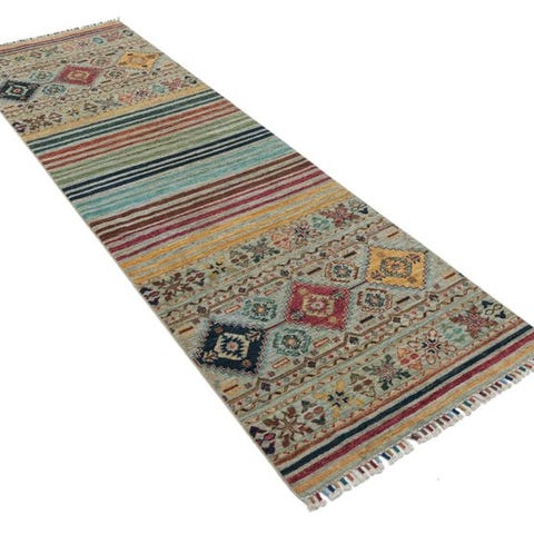 Dette håndknyttede designer tæppe løber imponerern med sit udtryksfulde Kazak-mønster og den ekstraordinære farvekombination. De klare geometriske former, kombineret med traditionelle ornamenter, giver dette stykke en fascinerende udstråling og gør det til et stilfuldt højdepunkt i enhver gang, stueområde eller indgang.
