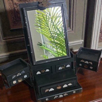 Et vintage kinesisk træsminkebord med spejl, porcelænskål og to skuffer fra første halvdel af det 20. århundrede. Enkelheden i dets linjer står smukt i kontrast til fretværksmotiverne på nederste hylde. Med sin mørke finish vil dette kinesiske sminkebord ca. 1910-1950 bringe et strejf af elegance til ethvert hjem, især i et soveværelse.