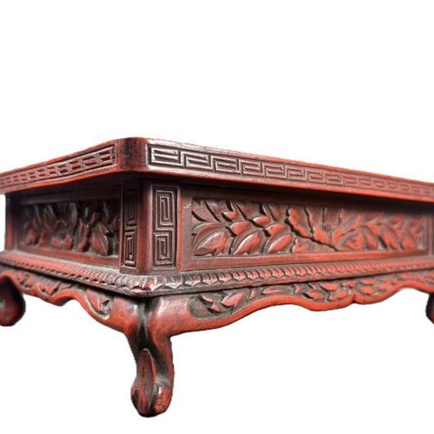 Et kinesisk udskåret cinnabarlakeret piedestaltøj i usædvanlig form, dækket af lag af vermilionrød lak fint udskåret med sammenhængende dekorative motiver.