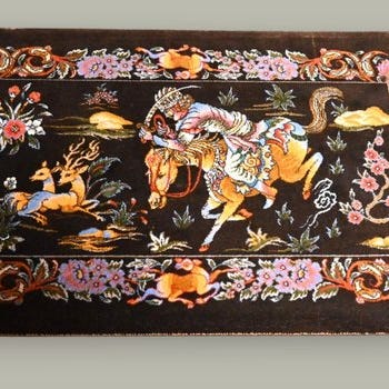 Fra Tyrkiet, dette luksus silke hestetæppe 90 × 60 cm, silke på silke, 21. århundrede, professionelt rengjort, i meget god stand, flerfarvet med sorte detaljer. Klik på den blå "gå til varen" knap, for at købe eller byde på denne vare. Den samlede pris vil blive vist inden du afgiver dit bud.