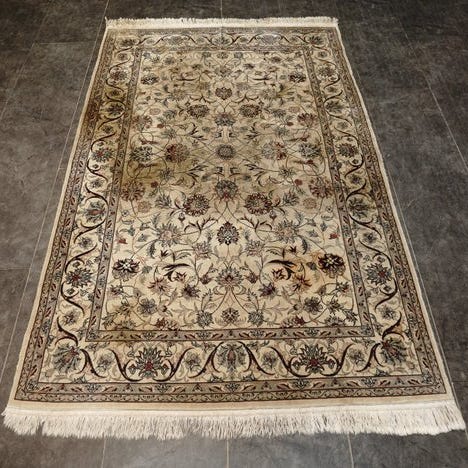 Det er et meget smukt fint Isfehan-tæppe fra Pakistan. Det er meget fint knyttet i 6x6, næsten 360.000 knuder pr. kvadratmeter. Designet og farvekombinationen er meget tiltalende. Se venligst på billederne.
