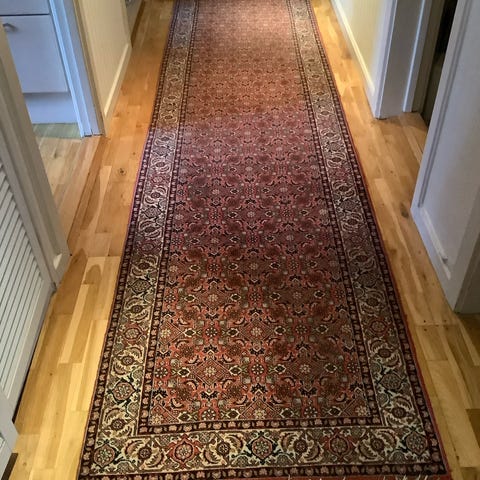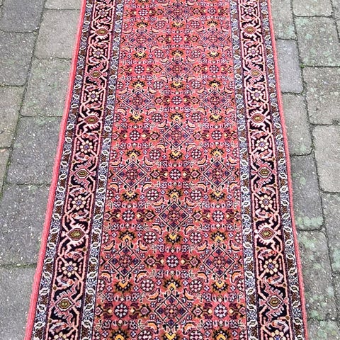 Oprindelse: Indien; Model: Bidjar; Størrelse 295 × 82 cm; 100% håndknyttet uldpeeling på bomuldslod, ca. 160.000 knuder, dateret til seneste del af det 20. århundrede (1980–1990); generelt god stand med brugsspor og slid af pile; professionelt rengjort. Klik på den blå "gå til varen" knap, for at købe eller byde på denne vare. Den samlede pris vil blive vist inden du afgiver dit bud.