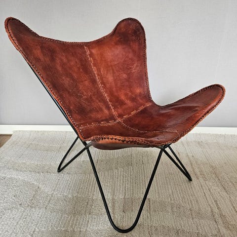Pragtfuld sommerfuglestol med sæde af brunt tykt læder. Øjenfanger!
