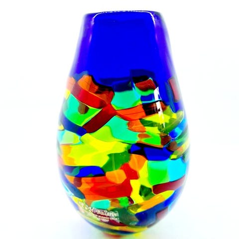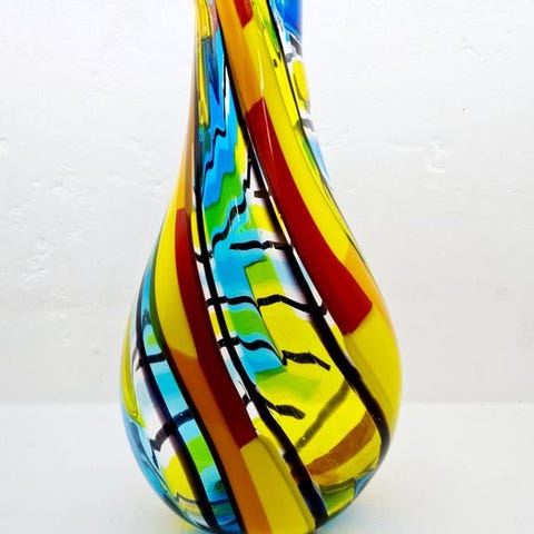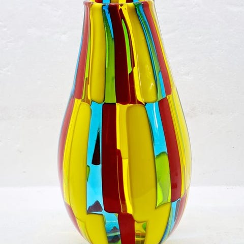 NYT DESIGN! Øjenfaldende og begrænset vase håndlavet af designer og mester glasblæser A. Ballarin i Murano (Venedig). Denne nye og fine vase er i begrænset antal tilpasset og leveres med certifikat for ægthed. Vasen er udført i en komplementær/primær farvekontrast. Personligt mener jeg, at det er et af Ballarins smukkeste designs.