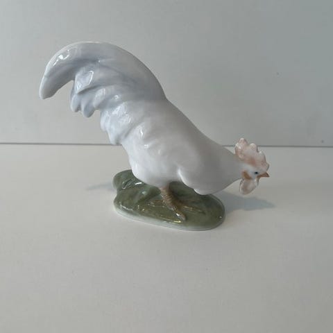 Dette er en figur af en hanen fra Royal Copenhagen, og ud fra billedet ser det ud til at være model nr. 1025 eller en lignende variant. Figuren er lavet af porcelæn og er håndmalet i de klassiske blå, grå og hvide farver, som Royal Copenhagen er kendt for. Den må typisk måle omkring 15-20 cm i højden. Værdien afhænger af tilstand og sjældenhed, men ældre versioner kan være eftertragtede af samlere.