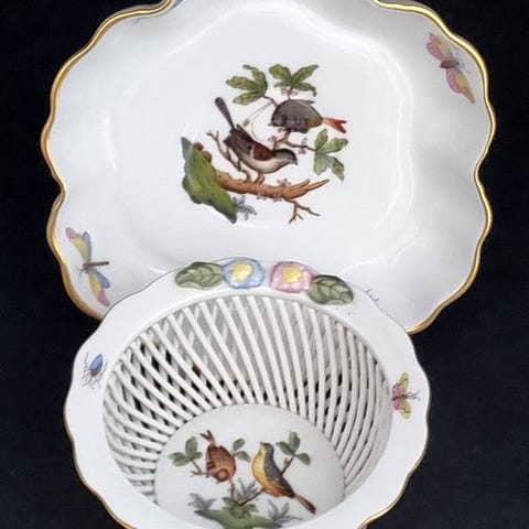 Herend håndmalet porcelæns ovalt centerpieces/kurv i Rothschild Bird-mønster, Ungarn, 1970–1985, i fejlfri stand; dimensioner 21,3 × 15,5 × 5,5 cm. Klik på den blå "gå til varen" knap, for at købe eller byde på denne vare. Den samlede pris vil blive vist inden du afgiver dit bud.
