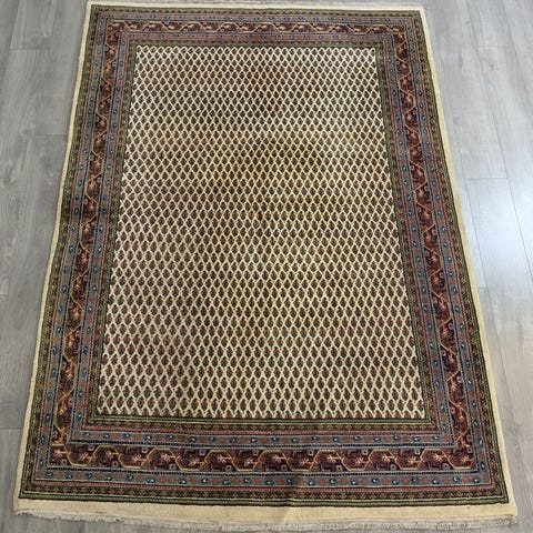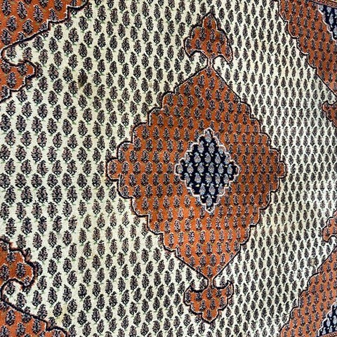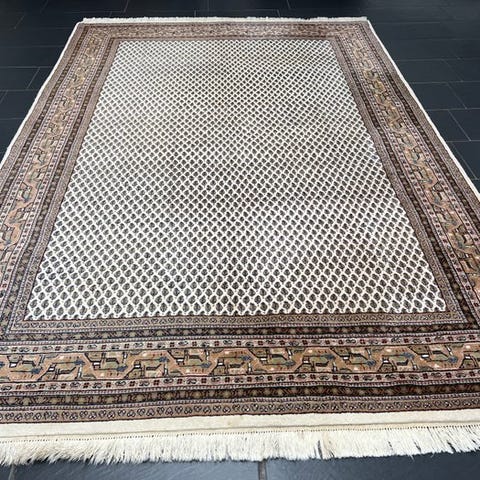 Det store baggrundsfelt er helt dækket af et fint, regelmæssigt arrangeret Mir-mønster (Boteh-motiv). De små, gentagne Paisley-former skaber en rolig, elegant helhed med en ensartet struktur. Den fler-rækkede kantlinie med traditionelle blomster- og geometriske elementer i varme brune-, beige- og rødlige nuancer indrammer feltet harmonisk og understreger tæppets klassiske karakter. På grund af dets rummelige format egner dette stykke sig ideelt til vidtspredte opholdsrum eller spisestuer.