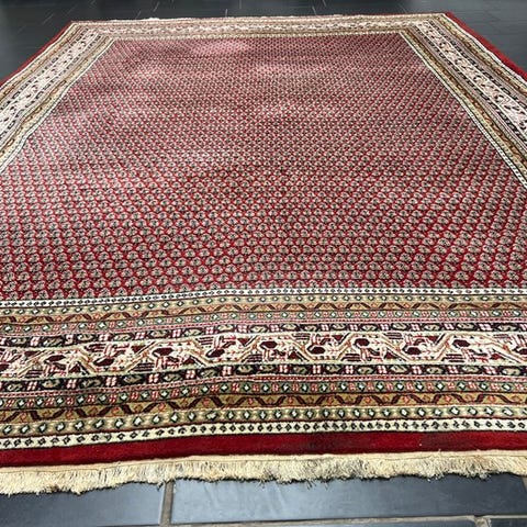 Indisk håndvævet orientalsk tæppe i Sarough Mir-design, målene ca. 324 × 256 cm, uld på bomuldsskelet, tilstand: i god stand med tegn på alder og slid. Klik på den blå "gå til varen" knap, for at købe eller byde på denne vare. Den samlede pris vil blive vist inden du afgiver dit bud.