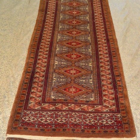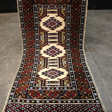 Pakistanisk tæppe, Bukhara-stil, uld på bomuld, flerfarvet, mål 300 x 81 cm, vægt 9 kg, fremstillet i det 21. århundrede, i særdeles god stand. Klik på den blå "gå til varen" knap, for at købe eller byde på denne vare. Den samlede pris vil blive vist inden du afgiver dit bud.
