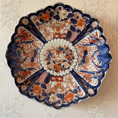 Kroppene er i porcelæn med polykromt mønster i blå kobolt, jernrød og orange højdepunkter i Imari-stil, med en rig stiliseret blomsterdekoration centreret omkring blomsterlige vaser omgivet af reserver og geometriske friser inspireret af orientalsk stil.