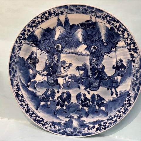 En stor blå-hvid kinesisk porcelænsfad med stiliseret blomsterdekoration, Kan...