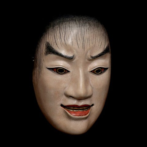 Among all Noh masks, the Okina (old man) mask is considered particularly sacred and has been at times treated as the embodiment of god, bringing longevity and prosperity to families. The mask is the oldest of the Noh repertoire and represents an older male with long white beard expressing wisdom.