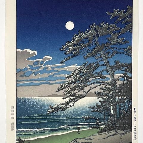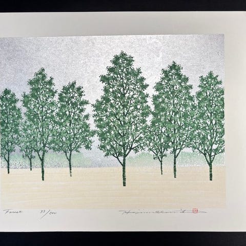 Originalt træsnit af Kawase Hasui (1883–1957), med titel Fuji no yukihare, udgivet af Doi Eiichi, cirka 1930–1940, pladesigneret, 27,5 x 40 cm, landskabsscene fra Japan, i fremragende stand. Klik på den blå "gå til varen" knap, for at købe eller byde på denne vare. Den samlede pris vil blive vist inden du afgiver dit bud.