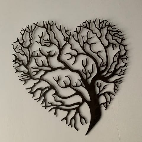 Smuk jernvægdekoration. Et træ med grene, der danner et hjerte. Et smukt symbol på kærligheden på væggen. Smuk til både indendørs brug og udendørs på terrassen. Dimensionerne er som følger: